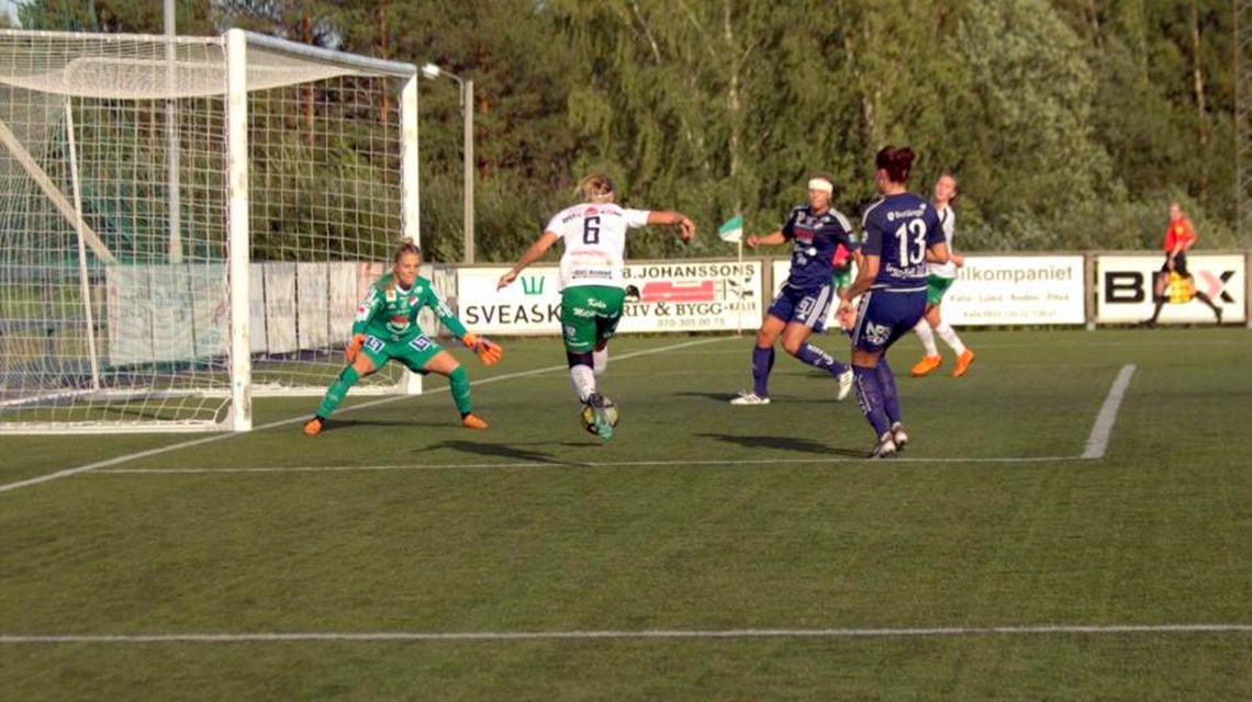 I minut 68 hade Emelie Helmvall en frispark i ribban. Minut 69 hade Josefine Hansson ett avslut i ribban och det började dofta mål för hemmagänget.